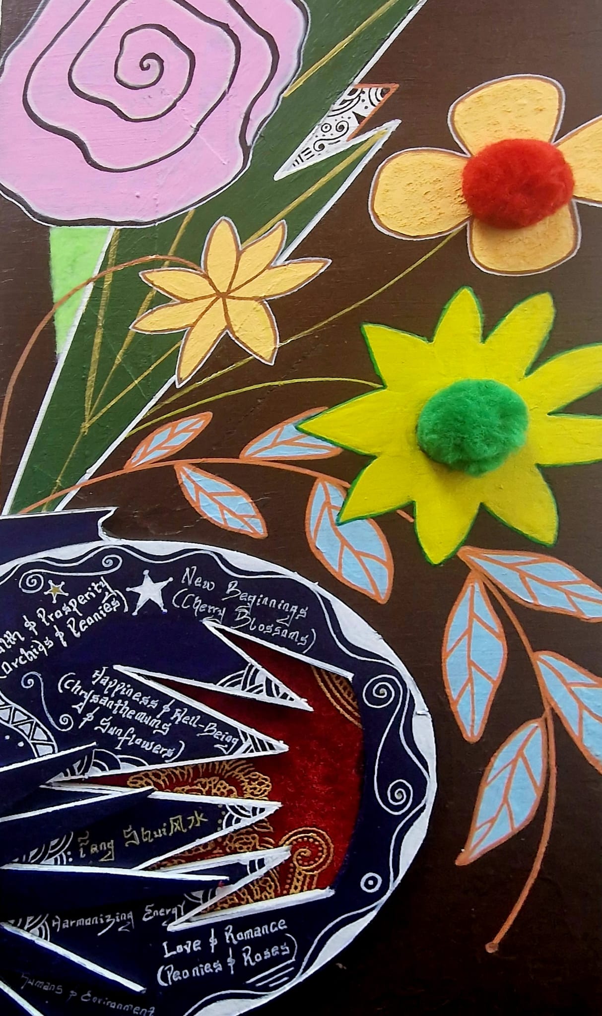 Media: Mixed-Media on Canvas Size: 100cm × 30cm This piece depicts the practice of feng shui. In Feng Shui, flowers are used to attract positive qi (energy) into a space, representing growth, harmony, and new opportunities. Different flowers hold unique meanings and can be used to achieve specific energetic effects depending on their symbolism, color, and placement. …