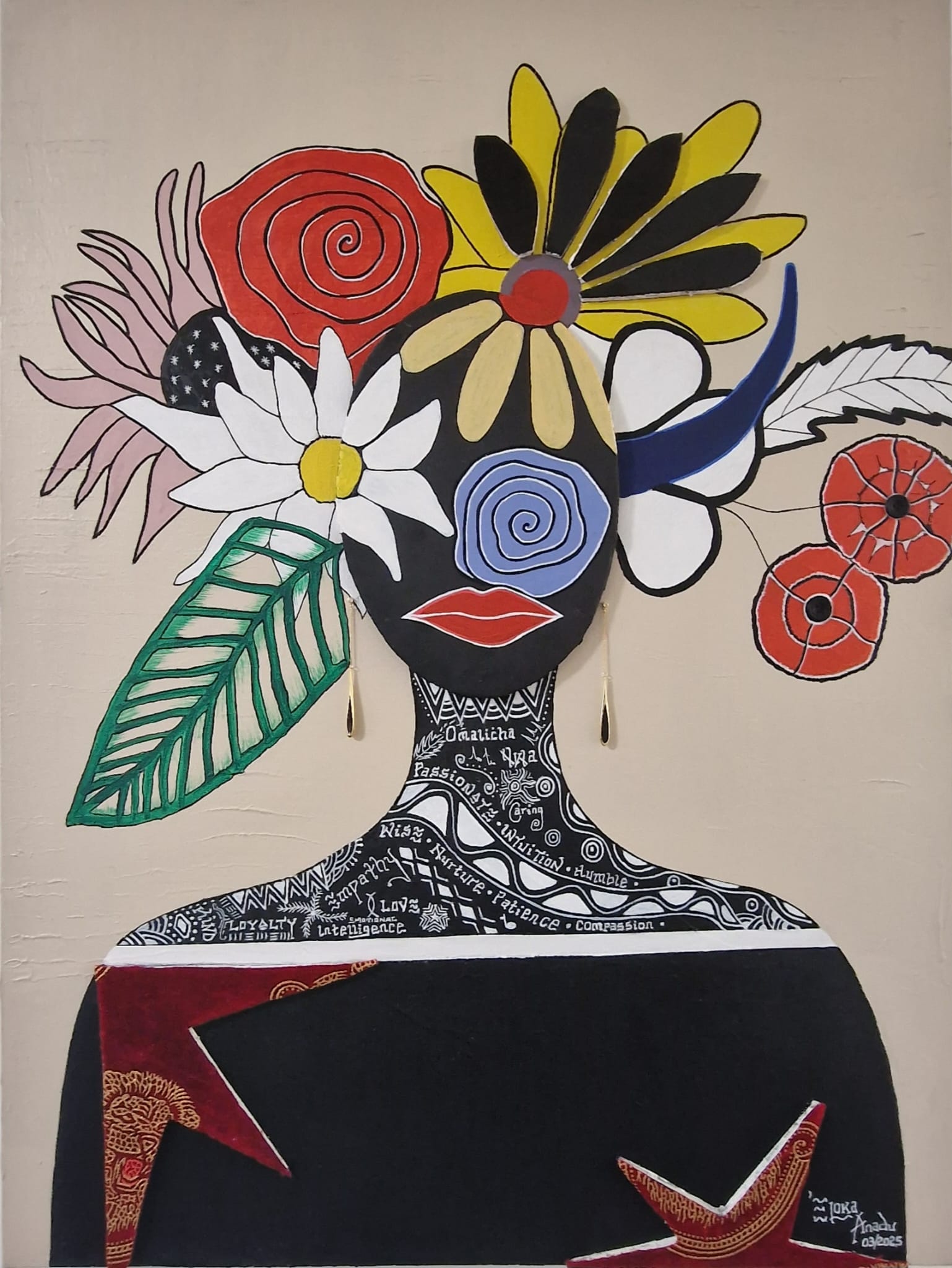 The central female figure is rendered in bold black silhouette, representing how society often sees only the surface mostly in women – the external form without recognising the vibrant inner world that exists within each individual. The deliberate absence of facial features shifts focus from physical appearance to the explosion of life emanating from within.
