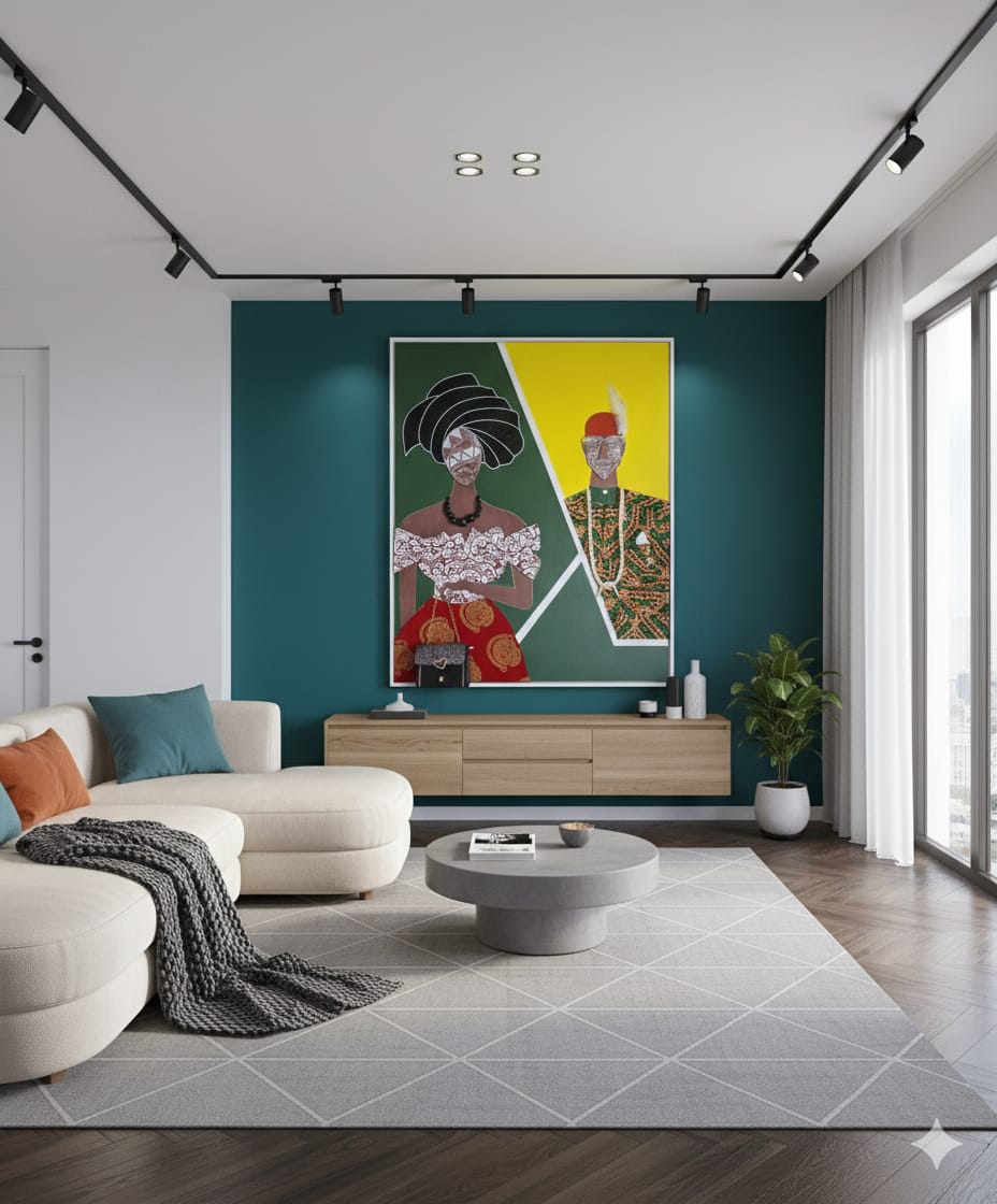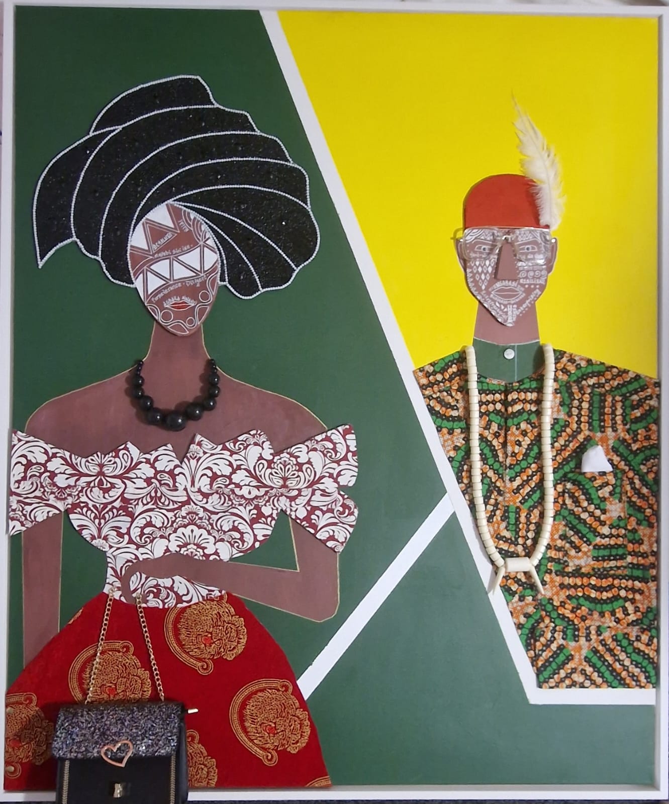 This striking contemporary piece celebrates the wealth, industriousness, resilience, and entrepreneurial spirit of the Igbo people through bold visual contrasts and sophisticated symbolism.