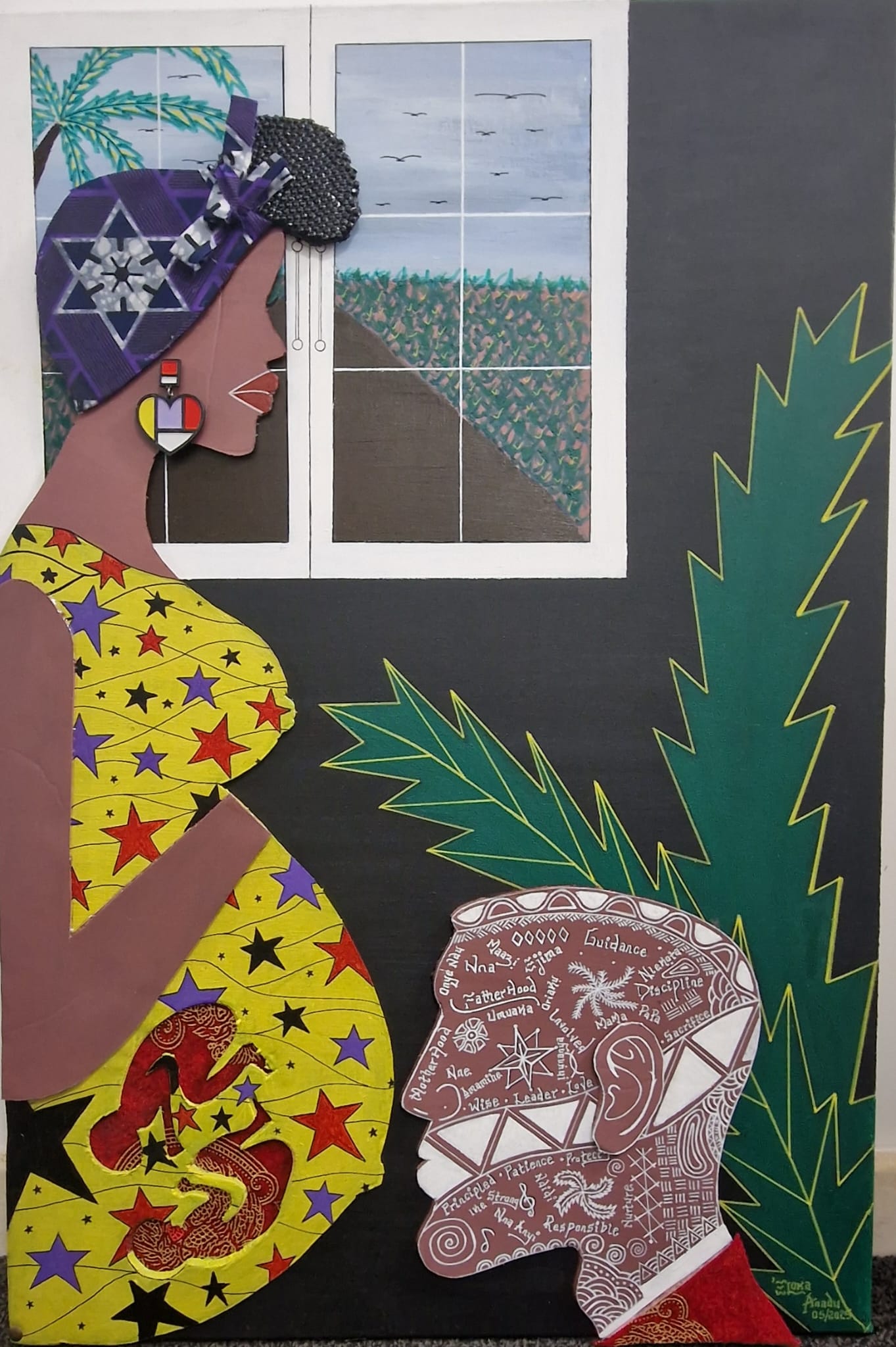 This piece celebrates the Joy of parenthood. It captures the contemplative moment of expectant parents – the partnership between mother and father, looking both inward at the lives being created and outward at the world those children will inherit. It celebrates parenthood as a journey of cultural transmission, hope, protection, partnership, and the passing down of dreams and heritage from one generation to the next, doubled in blessing and responsibility.