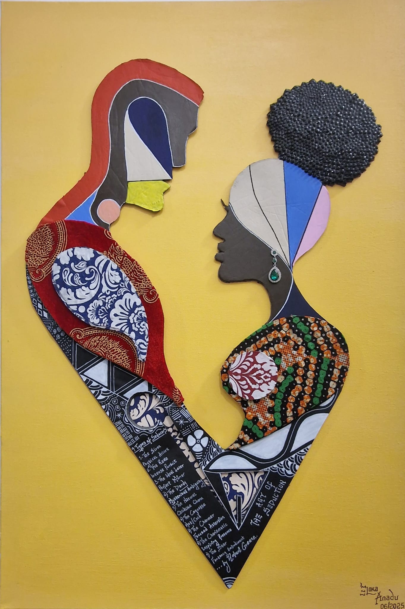 The two figures merge at the bottom, forming a heart-like form, depicting unity and interconnection. Both bodies are filled with text, patterns, and mixed-media collage elements representing the multiple layers of seduction, power, and allure explored in Greene’s work.
